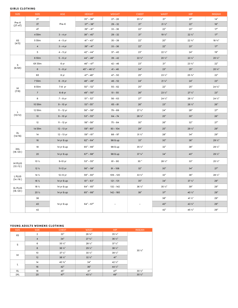 | XL (14/16) | 14 | 12-13 yr | 59"-61" | 88-97 | 30.5" | 28" | 32" | 29.25" |